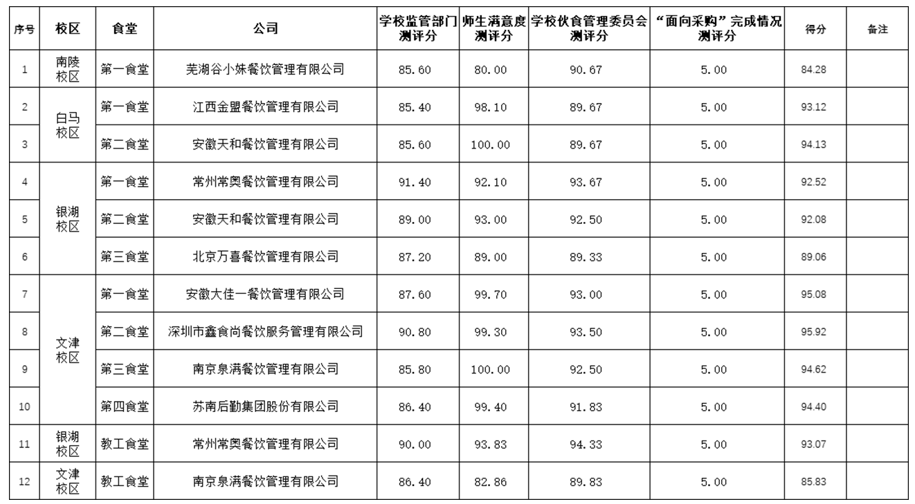 1.得分计算方式:学生/教工食堂考核得分=监管部门测评分+学生/教工满意度测评分+学校伙食管理委员会测评分+“面向采购”完成情况得分;