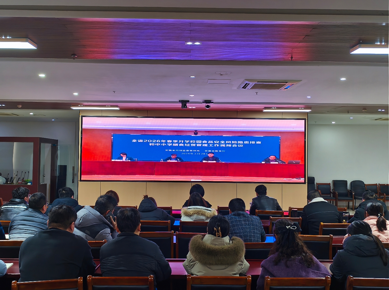 为深入贯彻落实食品安全“四个最严”要求,进一步强化校园食品安全监管,切实筑牢春季开学期间校园食品安全防线,2月28日下午,学校组织相关人员参加全省2026年春季开学校园食品安全风险隐患排查暨中小学膳食经费管理工作视频会议。校党委委员、副校长、学校食品安全总监高文参会并作部署讲话,学校食品安全员、各校区相关工作人员、各食堂食品安全总监及食品安全员近30人参加会议。